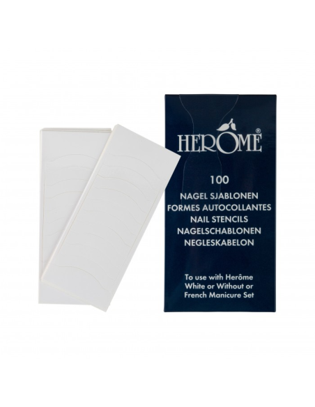Les Formes Autocollantes Herôme ont été créées spécialement pour être utilisées en compléments de Herôme Bord Parfait de l’Ongle. Placées correctement au bord de l’ongle, elles permettent de redessiner le bord blanc de l’ongle sans bavures et d’obtenir un joli eet french manucure.