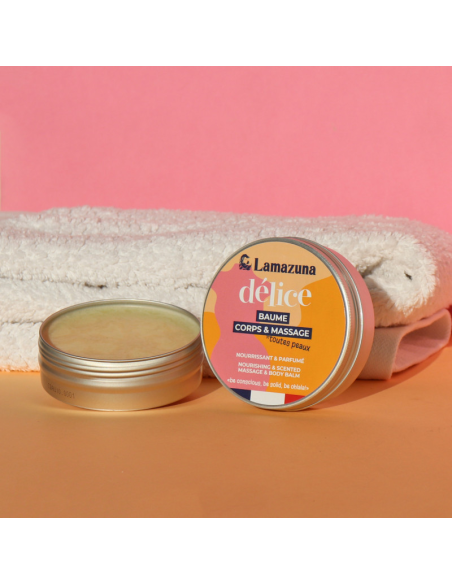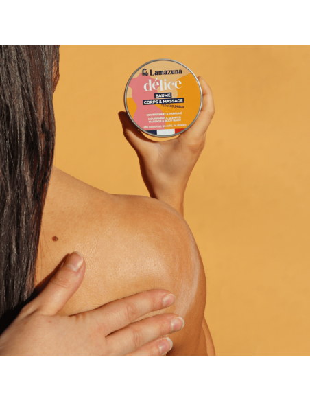 Composé d’huile d’olive bio et de squalane végétal, le baume Délice nourrit et protège la peau, tout en l’enveloppant d’un parfum gourmand. Il pénètre facilement et ne laisse pas de film gras.