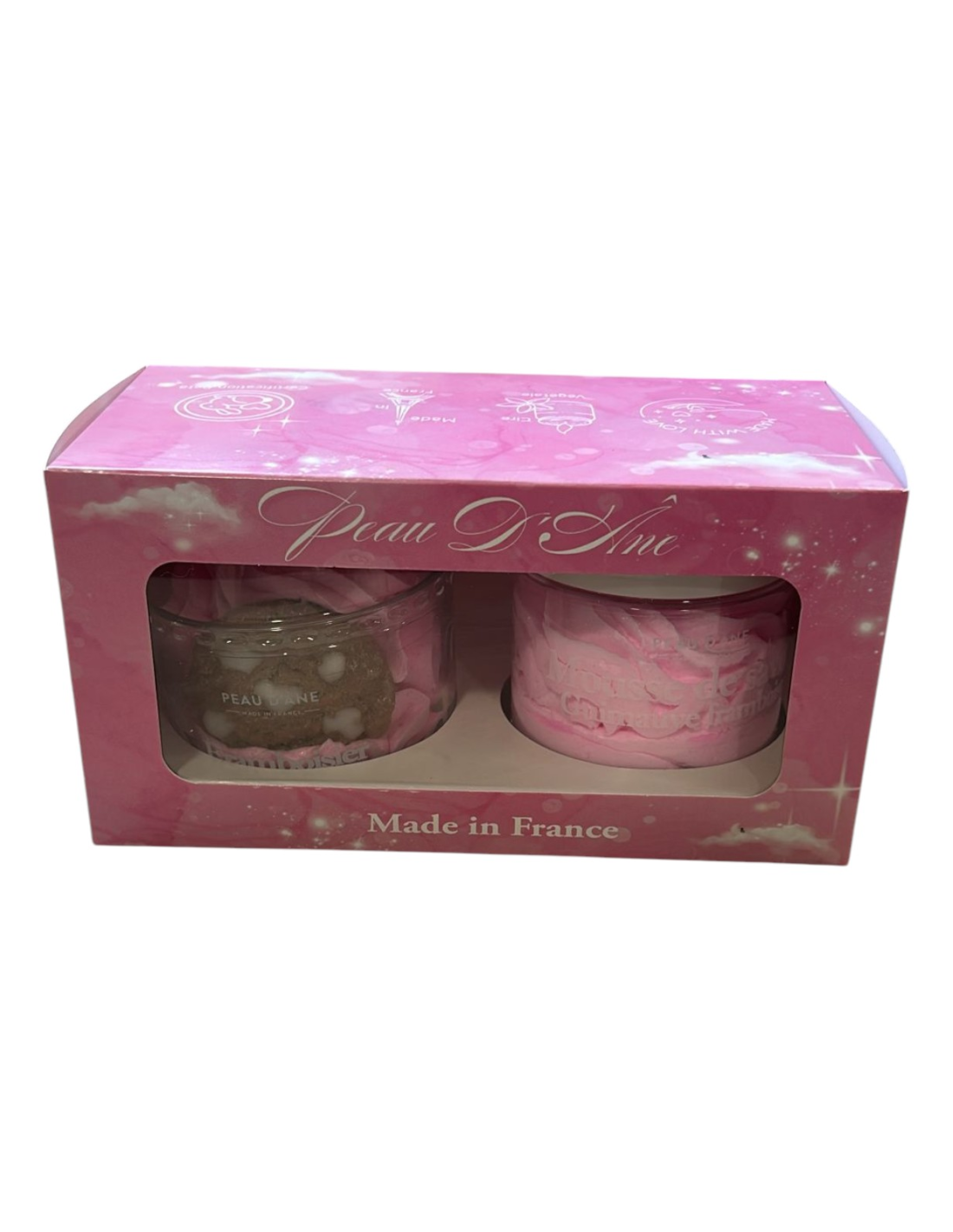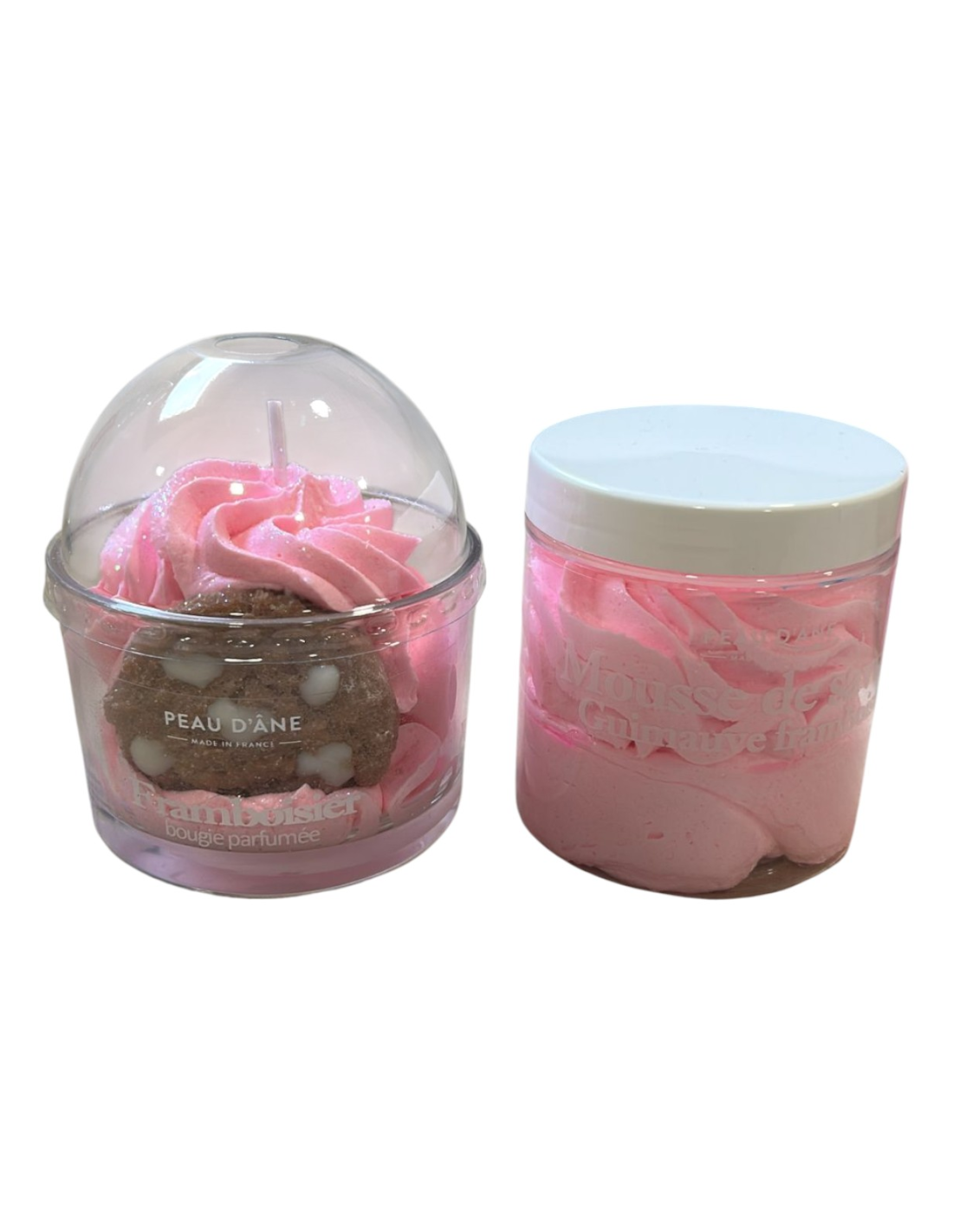 Coffret parfumé contenant une bougie framboisier et un mouse de savon framboise.
