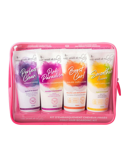Cette routine est composée du shampooing Perfect Clean, de l'après-shampooing Pink Paradise, de la gelée hydratante Boost Curl, et du lait capillaire Smoothie Ananas, en format 100ml, idéal pour voyager !