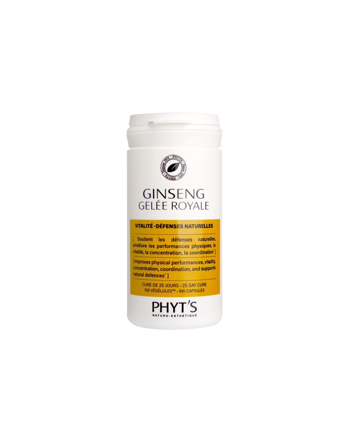 Ginseng rouge (Panax ginseng) – Gélule (hydroxypropylmethyl cellulose) – Gelée royale Bio lyophilisée – Agent de charge : Gomme d’Acacia Bio – Anti-Agglomérant :