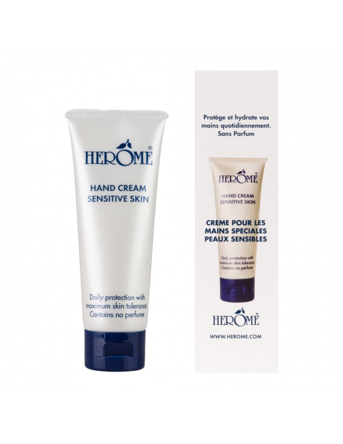 Herôme crème pour les mains peaux sensibles ne contient pas de parfum. Son PH est neutre. Les éléments qui la composent garantissent une tolérance cutanée maximale avec ces extraits de concombre et de camomille. Elle pénètre rapidement dans la peau et résiste à l’eau.