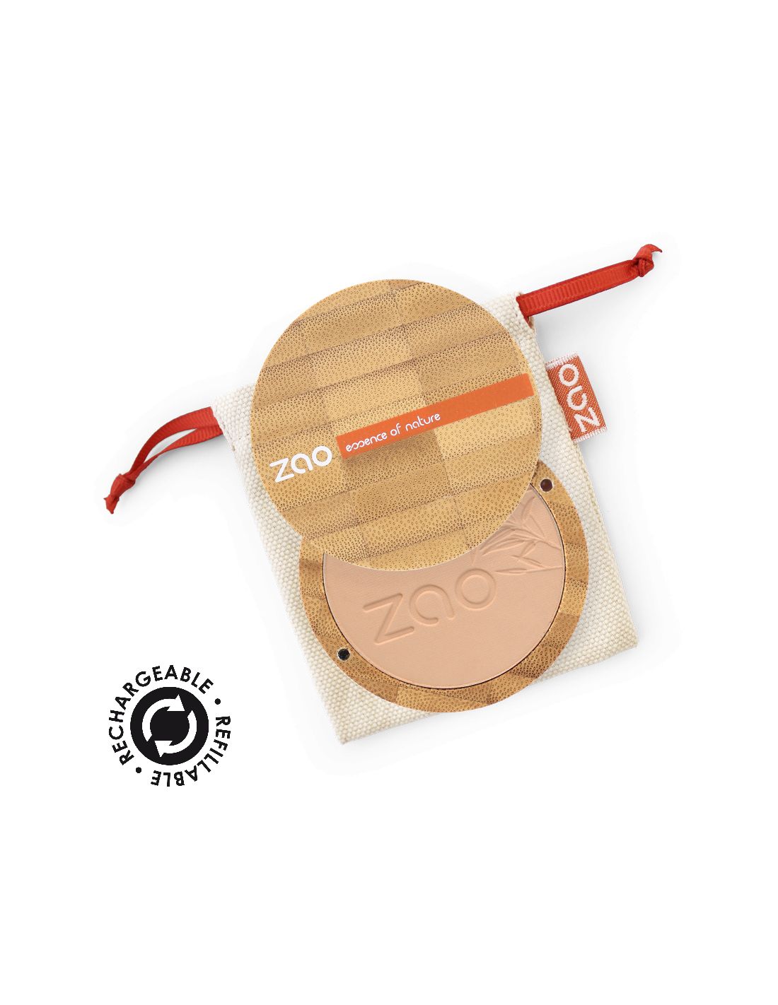 Appliquez l’une des Bases de teint Zao (700,750 ou 751), puis la Poudre compacte à l’aide du Pinceau poudre 702, en mouvements circulaires, en partant du centre vers les contours du visage.