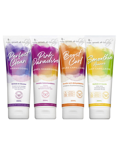 Pour les cheveux frisés épais vous retrouverez : le shampooing Perfect Clean, l'après-shampooing démêlant Pink Paradise, la gelée capillaire Boost Curl pour définir vos cheveux et du lait capillaire Smoothie Ananas.